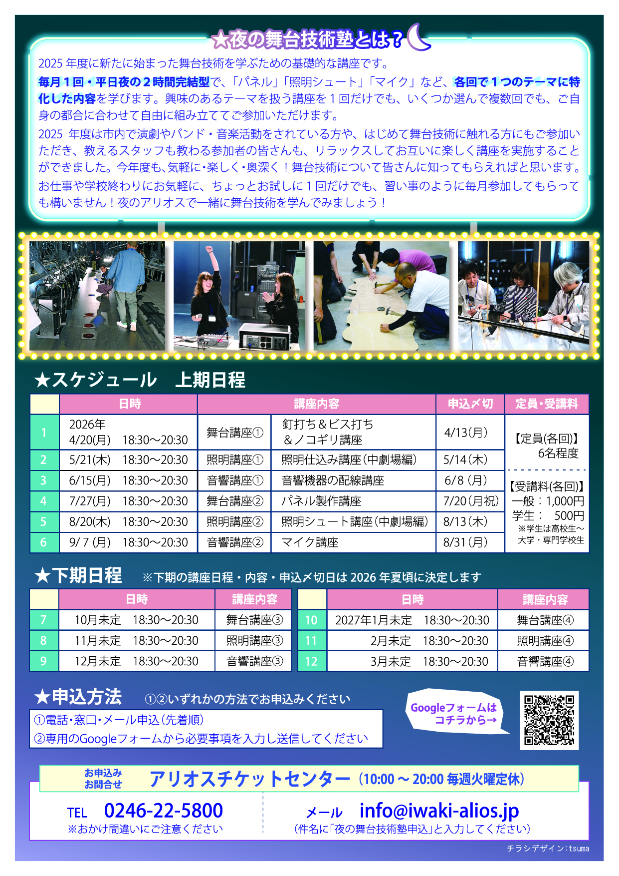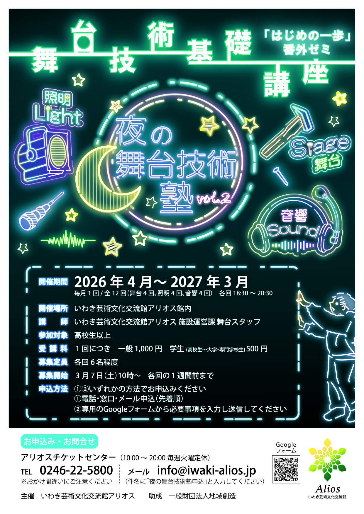 | 申込み方法 | 【上期】 ①②いずれかの方法でお申し込みください 募集期間:3月7日(土)~各回の1週間前まで ①電話・窓口・メール申込(先着順) 電話 アリオスチケットセンター 0246-22-5800 (10:00〜20:00 / 火曜定休) (先着順) ※電話番号のおかけ間違いにご注意ください。 窓口 本館1階 インフォメーションカウンターでも受付いたします(10:00〜20:00 第2火曜休館) メール info@iwaki-alios.jp (※件名に「夜の舞台技術塾申込み」と入力してください) ②専用のGoogleフォームから必要事項を入力し送信してください 申込み専用フォームはコチラから 〔チラシのダウンロード〕 【上期】舞台技術基礎講座「はじめの一歩」番外ゼミ チラシ(表面)(JPG:2.1MB) 【上期】舞台技術基礎講座「はじめの一歩」番外ゼミ チラシ(裏面)(JPG:2MB) |
