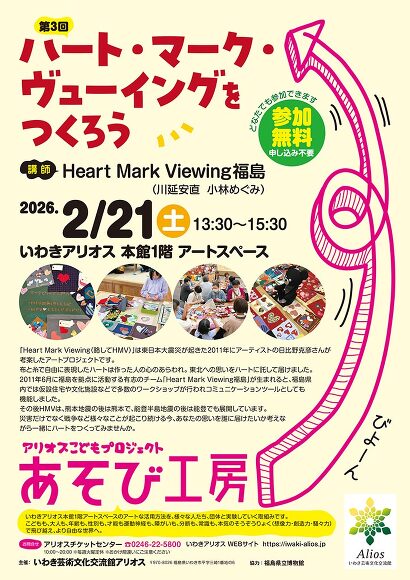 「Heart Mark Viewing(略してHMV)」は東日本大震災が起きた2011年にアーティストの日比野克彦さんが考案したアートプロジェクトです。布と糸で自由に表現したハートは作った人の心のあらわれ。東北への思いをハートに託して届けました。2011年6月に福島を拠点に活動する有志のチーム「Heart Mark Viewing福島」が生まれると、福島県内では仮設住宅や文化施設などで多数のワークショップが行われコミュニケーションツールとしても機能しました。その後HMVは、熊本地震の後は熊本で、能登半島地震の後は能登でも展開しています。災害だけでなく戦争など様々なことが起こり続ける今、あなたの思いを誰に届けたいか考えながら一緒にハートをつくってみませんか。